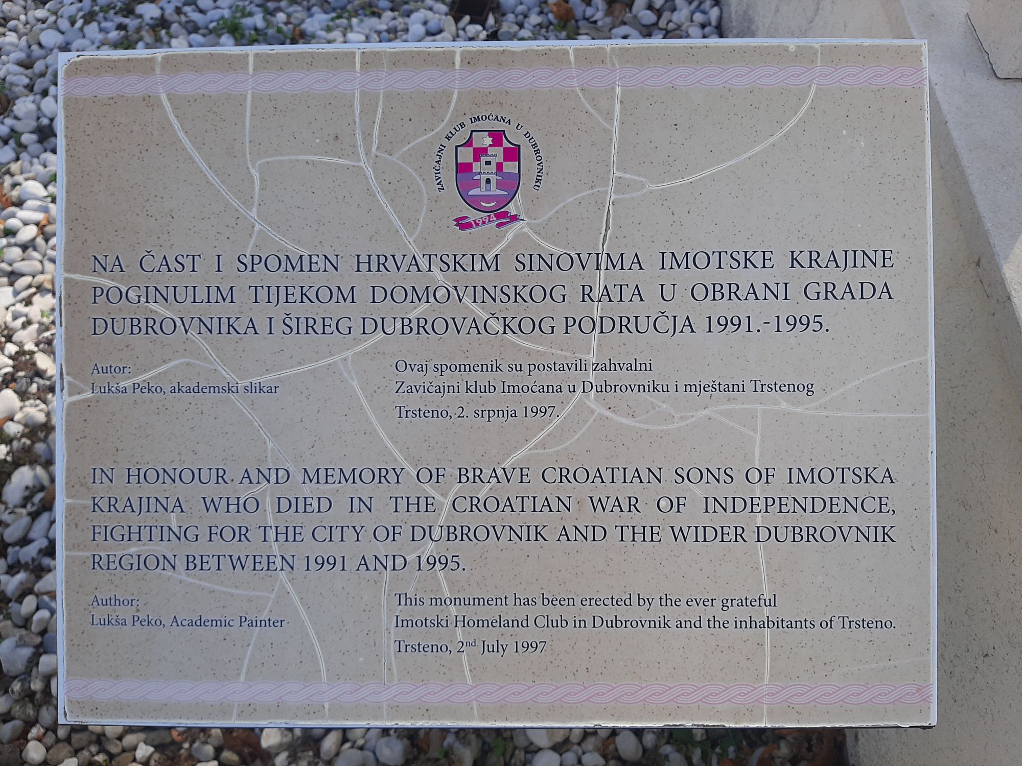 Tijekom Domovinskog rata više od pet tisuća branitelja iz Imotskog sudjelovalo je u obrani Dubrovnika i šireg dubrovačkog područja. Njih 36 u tim je borbama poginulo. Njima je 1997. u Trstenom, mjestu blizu Dubrovnika, podignut spomenik. Autor ovog spomenika istaknuti je akademski umjetnik, Lukša Peko.
