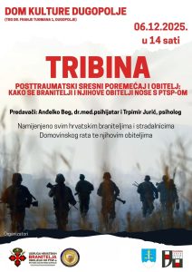 6.12. u 14 sati u Domu kulture Dugopolje održat će se tribina na temu Posttraumatski stresni poremećaj i obitelj: Kako se branitelji i njihove obitelji nose s PTSP-om. Predavači su: Anđelko Beg, dr. med. psihijatar i Trpimir Jurić, psiholog